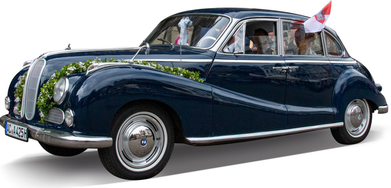 Unser Barockengel, eine dunkelblaue BMW V8-Limousine von 1962 geleitet Sie mit bewährtem Chauffeur zu Ihrer Hochzeit, Ihrem Jubiläum oder Ihrem besonderen Tag.